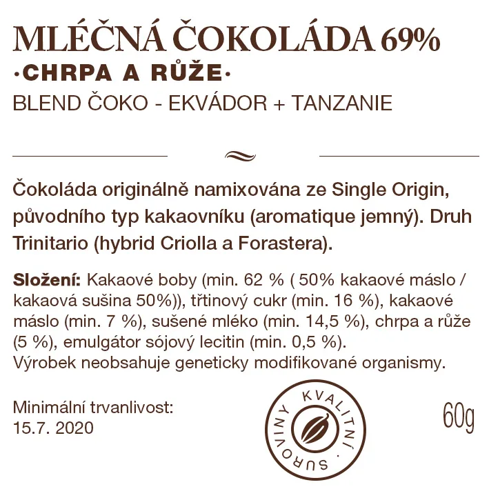 - Mléčná čokoláda 69% (Kakaová hmota – 41%kakaové máslo, 29% kakaové sušiny, cukr třtinový, sušené mléko, sojový lecitin)