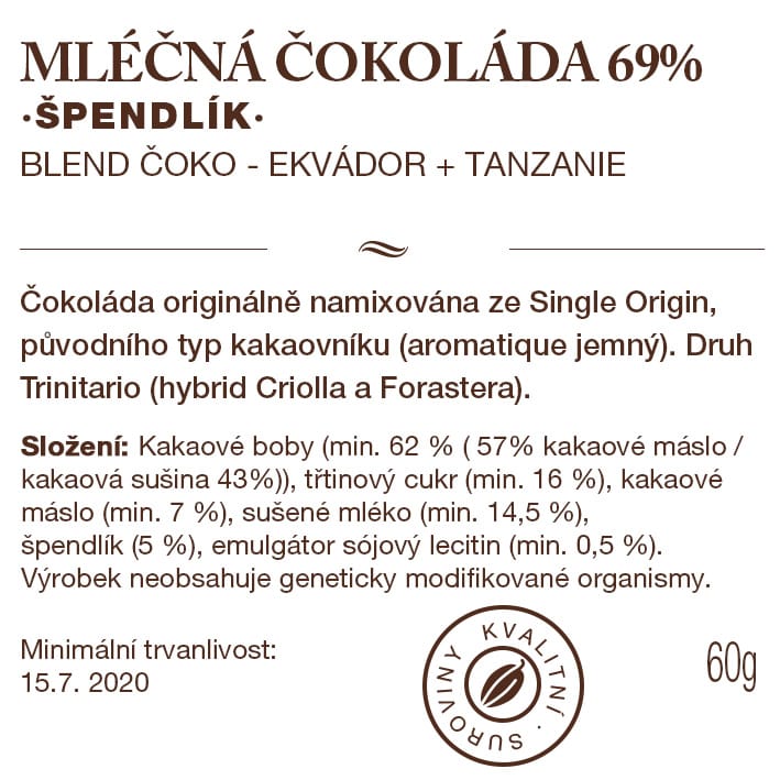 Originální BLEND čokolády ČOKO. Tabulka silné mléčné čokolády s příchutí špendlíku. Náš blend ČOKO dodává mléčné čokoládě silnou chuť a to díky velkému podílu kakaové hmoty 69%. Skvělý dárek pro odborníky, kteří chtějí mléčnou čokoládu s minimem mléka a cukru. Tabulka čokolády s pikantní chuti špendlíků. Je na vás tato čokoláda moc silná, můžete vyzkoušet 42% špendlík s mléčnou čokoládou .