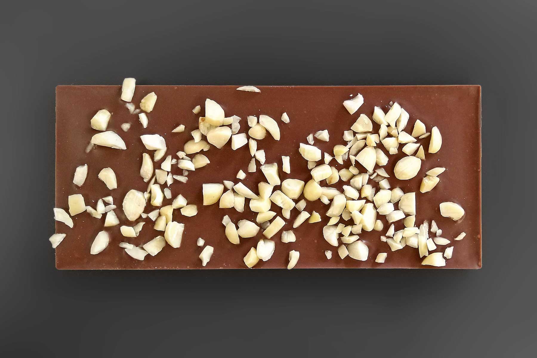 Tabulka mléčné čokolády s mandlemi na vrchu. Ručně vyráběná a sypaná kvalitními mandlemi, tabulka čokolády.